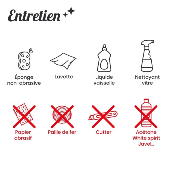 Il est formellement déconseillé d’utiliser des produits abrasifs type paille de fer, cutter et papier abrasif, au risque de faire des rayures. De même, les produits ménagers corrosifs de type acétone, white spirit, javel, alcool à brûler,ect … sontformellement incompatibles avec nos produits car ils agressent les encres de l’impression.